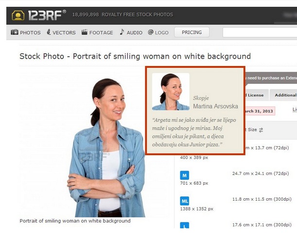 klasifikaciji hrane pašteta = junk (znate onaj vic kad mesarev šegrt čisti radnju? Gleda odbačene papke, kljunove, kožice i sl. pa kaže: „pa, šteta da se ovo sve baci… pa šteta, pa šteta… Pašteta! 🙂 ) tek kad sam se svojim očima uverila da zaista meso ulazi u mašine za preradu, probala sam Argetinu paštetu. I bi fina, ni nalik na ono djubre koje su nam poturali kao klincima, puno bibera i od kojeg se podriguje. Čak iako niste (a verovatno niste) videli fabriku, mogli ste da steknete utisak o tome koliko je sastav kvalitetniji od neke tamo djačke paštete po ceni peoizvoda i po odabiru ambalaže (koji je meni, takodje, problematičan jer se trudim da uvek biram ekološki svesnije proizvodjače, dakle, u ovom slučaju bih radije kupila paštetu u crevu nego u limenci (?!). Srećom, ne kupujem paštetu). Raspisala sam se na temu Argetinog kvaliteta jer zaista jeste ispred većine konkurenata, prema tome, bilo bi lako naći nekoliko potrošača koji bi javno rekli da jedu Argetinu paštetu, ili je daju deci, babi, dedi, psu, ribicama… Možda je to i bila suštinska ideja Argetine kampanje. Ali, očigledno je neko licnuo olovku (pardon, otvorio Excel) i izračunao da bi mnogo koštalo da sve te potrošače pronadju, pozovu, nauče tekstu, očešljaju, snime, itd. Mnogo je jeftinije, jednostavnije i brže da kupe gotove stock fotografije (to su Vam fotke iz neke ogromne baze koje koštaju malo jer se iz istog seta proda na stotine fotografija u celom svetu raznim magazinima, sajtovima, agencijama…). Ionako izgledaju kao da smo slikali potrošače, zar ne? A tekst ćemo sami da napišemo, to nam je sigurica, bolje nego da potrošač nešto „lupi“, zar ne?