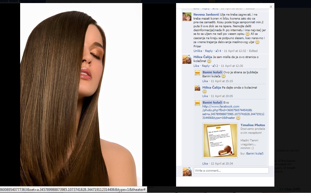 zamislite, kolačima, koji je tada bio star 9 dana, u stilu „evo ti, na, a sada da se vratimo pranju kose“. Znate, opasno je kada se čovek površno bavi nečim. Kada površno učite o online PR-u, naići ćete na savet da treba postovati i o drugim sadržajima, nevezanim, nužno, za Vaš proizvod. Ali, ako dublje udjete u ovaj savet, morali biste naučiti da sadržaji ipak moraju imati logičku vezu sa Vašim proizvodom, nekim njegovim sastojkom i sl, ili se mogu ticati aktuelnosti iz ugla Vas kao proizvodjača. Takodje biste morali znati da u ravnoteži dobrog PR-a nerelevantni sadržaji ne smeju da predju 30%. Što se tiče informacija o proizvodima, niko ne brani, štaviše, poželjno je, bitne činjenice ponavljati i parafrazirati, jer, prostim pogledom na statistiku, shvatićete da nisu baš uvek svi fanovi videli sve, uostalom, retko ko je baš stalno na mreži. Kada se i u narednim danima na Baninijevoj stranici kozmetički PR nastavio, „odlajkovala“ sam stranicu. I to teška srca, jer sam u offline životu veliki fan Baninijevih zlatnih cvetova i Gustava sa čokoladom, pa bi mi, na primer, značila informacija kada su ti proizvodi na akcijskim sniženjima (a bili su, ali na FB stranici nije bilo pomena), i slične informacije o proizvodima, a ne recepti za sjajniju kosu. Nažalost, dokle god je „broj lajkova“ merilo po kome se proizvodjaču naplaćuje vodjenje stranice, ne može se govoriti ni o kakvom uticaju na rast prodaje. A zahvaljujući takvom diletantskom „radu“ na FB-u ne čudi podozriv stav srpskih fabrika prema ovom novom mediju. Jer ovde je onaj koji treba da dâ proizvodu dodatnu vrednost, uradio upravo suprotno.